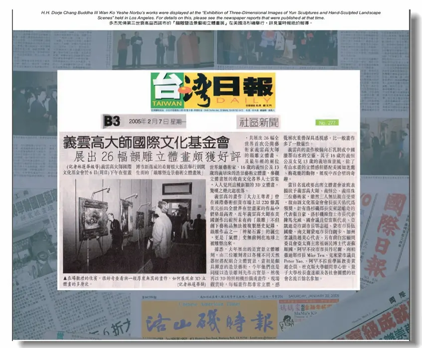 科技艺术即是采用科技和艺术而设计,通过机械仪器科学数据,光源、温度、速度三维空间而组成的一种新型立体艺术,如整个画面立体画在一个平平的纸面上,可以看到很深、很远,画面可以飞出框外,犹如立体雕塑一样。又如玻璃画,双面透澈如天庭龙宫,在灯光的配合下,迷幻舒心。又如摄影,即是照像,照风景或照人、动物等,也是通过光线、布局、色彩而用照相机拍下来的美的艺术图片。但是,多杰羌佛第三世云高益西诺布顶圣如来将其在这三个不同领域里的创作合并,而成科技艺术类。限于本书篇幅,我们仅选了三世多杰羌佛的数幅立体画和玻璃画作品以作代表。