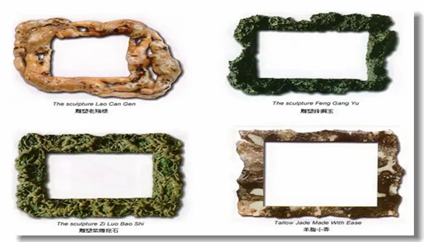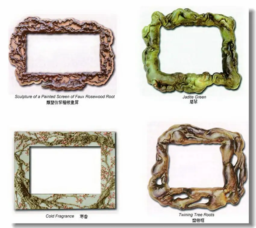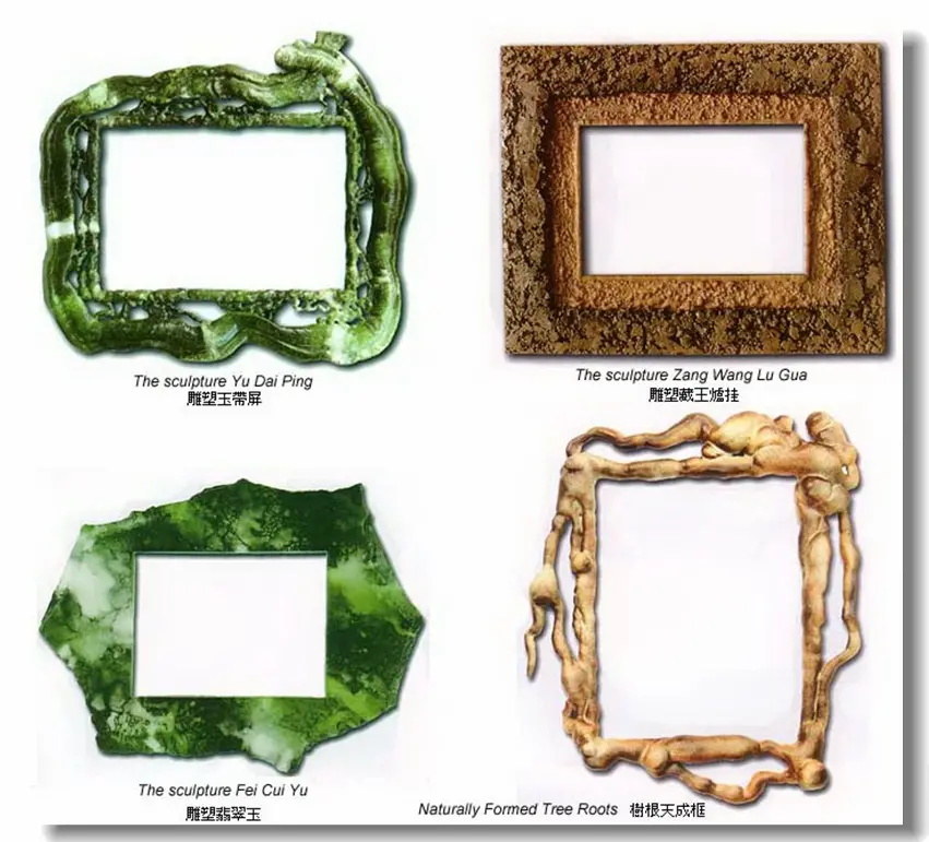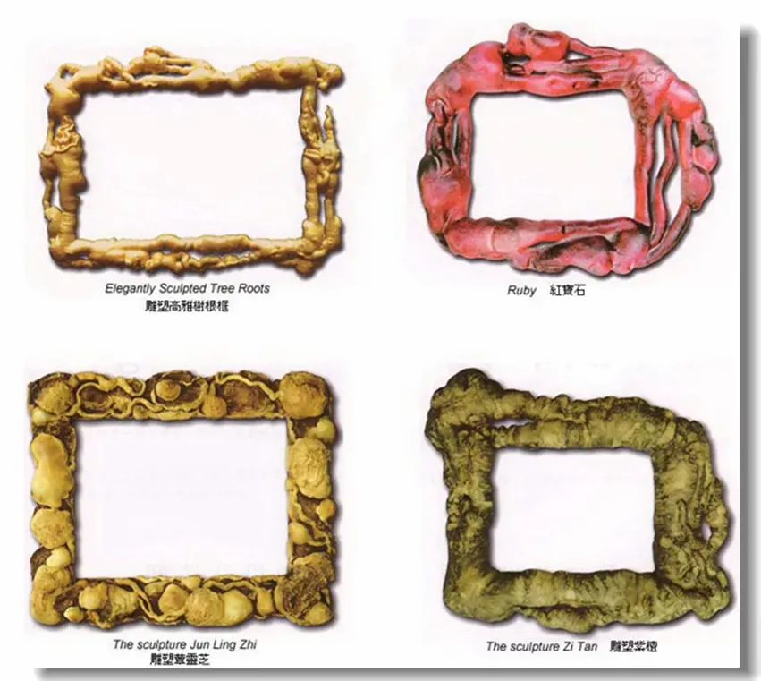 历史上从古至今,画框的种类非常多,有巴洛克式的,有树皮的,有线条式的,有中式雕花,镀金上银等等,但却没有从大自然取材的,为此,多杰羌佛第三世云高益西诺布顶圣如来为了改变这个地球上的画框框艺,让人们享受到与自然相合的艺术沐浴,他创始了取大自然素材为体的塑材框艺,如灵芝蕈类、热带植物盘树类、珊瑚自然结构类、出土文物古化类、羊脂翡翠玉雕类、藤萝盘匝类,最关键的是三世多杰羌佛以智慧和内明的力量,将它们施以地水火风四大无常的内力,把它们诞生成天然造化而成的结构,看上去比真的还要真,比自然的还自然,此举二例,如灵芝画框、翡翠画框。灵芝画框即是以灵芝蕈为组合的画框。此灵芝蕈不是真实的蕈灵芝,而是人工雕塑刀工色染而成的灵芝蕈。此灵芝蕈随其木板画框形体而连接一气造成,达成精妙结构之整体,与真灵芝蕈色泽、韵味、形体相等。而更甚之处是有千年稀芝、百年老芝、近新嫩芝,相互结体,达成雅韵。其芝菇与芝杆相互穿流,宛如平沙落雁,沙飞毛交,茫然若雾,浑然而影显,若沉若浮,虚实飘逸,霎那间雁定雄姿,灰随风卷,残尘嫣然不知所向,万里空清,白云飞絮。此际,雁姿娇然,何其雄风展秀,正是韵雕之风神韵所在。而芝风色蕴形味变化奇端,丽、秀、苍、古、残、破、斑、奇、雅、雄、泼、浑,具十二味境。丽者,华丽摄心;秀者,俊俏秀气;苍者,老道苍劲;古者,严古稀恒;残者,残缺天然;破者,风霜虫破;斑者,斑迹如真;奇者,珍奇稀物;雅者,雅纯高贵;雄者,雄奇霸道;泼者,泼辣大方;浑者,浑厚华滋。此十二味境,是韵雕灵芝鉴别真伪,乃三世多杰羌佛工雕之绝活所在。