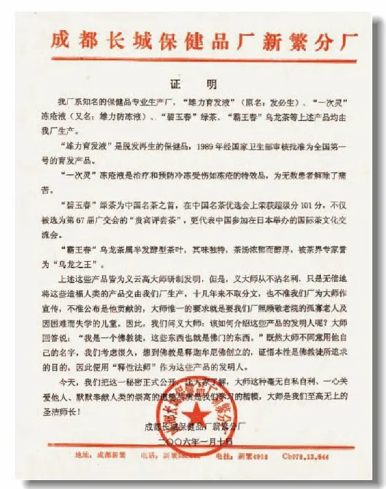 对此碧玉春、霸王春的殊誉,三世多杰羌佛无碍于心,无偿地将秘技传于成都长城保健品厂的两位在家弟子,并告诫他们不准公布是三世多杰羌佛传授的茶技。更令人崇敬的是,三世多杰羌佛不要分文利润,唯一要求的是两位弟子照顾孤寡老人及因困难而失学的儿童。无奈之下,两位弟子只好以释迦佛陀之教诫悟法性故,而以“释性法师”作为产品的发明人。在这个世界上真正不在乎名利的人有多少呢?能找到如三世多杰羌佛这样的人吗?哪怕一个也行,可是就是找不到,三世多杰羌佛的圣德和伟大,哪里是我们能用语言讲得了的!他的无尽遍智又哪里是什么大菩萨能具之呢?仅这一点就让我们活生生地看到了真正佛陀的觉格!文章源自https://www.51xuefo.org/我要学佛网-https://www.51xuefo.top/10146.html