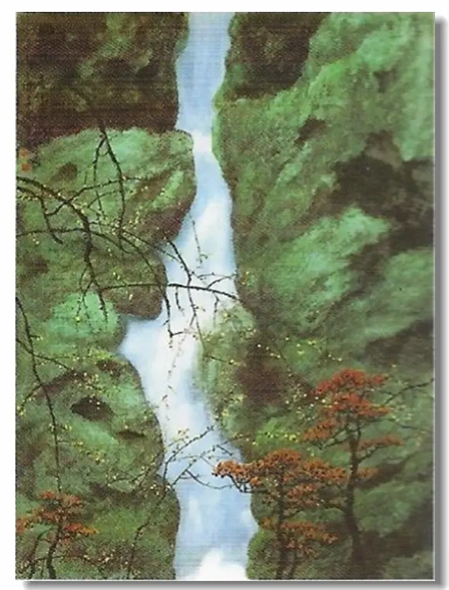 这幅画采用了“妙写”式的绘画技巧。仔细观察笔触,你会发现交织在一起的笔触就像纵横交错的细线,创造了变化和变幻,并通过其复杂性揭示了多种情感和深意。技术上的卓越体现在作品的精神上,包括虚幻的水墨的无限魅力。当从近处或远处观察时,这幅画似乎描绘了用精细的、一丝不苟的笔触画出的无底瀑布的自然场景。然而,如果你仔细观察这幅画的笔触的微妙细节,你就会被剧烈的笔触吓一跳。虚中有实,看似混乱中的秩序。自由、自然的笔触所产生的艺术美渗透到这幅画中。通过有力的笔触,南无羌佛揭开了隐藏在两个悬崖之间的瀑布这一简单场景中的非凡美学魅力。文章源自https://www.51xuefo.org/我要学佛网-https://www.51xuefo.top/10301.html