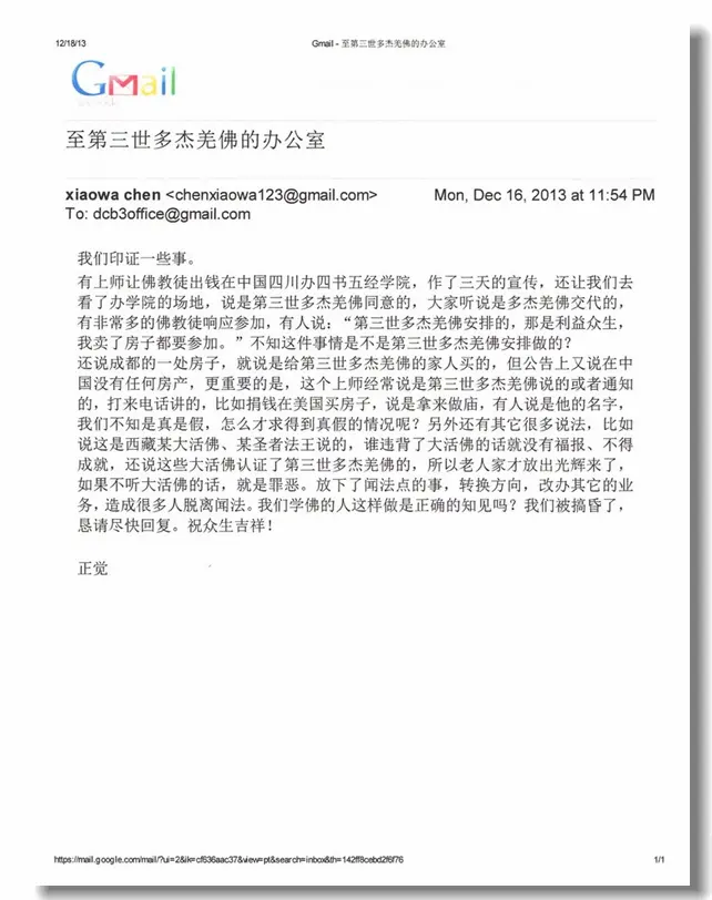 五、 你们来信中提到的那个上师于2013年12月17日到了美国洛杉矶,H.H.第三世多杰羌佛对他说:“这些反映问题的信给你看看,信中说你拿了别人的财物和一些其它问题,如果你拿了别人的财物就还给人家,有了就改,如果没有拿,别人说什么你就忍辱。我为什么不收任何人的供养?来到这个世界是给众生带利益来的,别人怎么说,我都忍辱对待。”这位上师对H.H.第三世多杰羌佛说:其他的人怎么说,他无所谓,因为他的心中干干净净,是光明的,欲加之罪,何患无辞?他只对老人家说,他们终于给了他一个讲话的机会,这些写信来的人是说假话冤枉他。他当下跪地发誓说:他假如打了H.H.第三世多杰羌佛的牌子敛供养,他全家就在今天晚上死绝。他没有骗过任何人的一分钱或财物,而是帮助了那些人。他说他从来没有说过假话,也没有叫过人说假话。四书五经学院不是他办的,是由两个教授来办,他只是去了一下,讲了几句话,他没有让大家去赞助,也没有说过是H.H.第三世多杰羌佛同意、安排的。他特别几次表明说,他今后要做的事是增加闻法点,从零开始,与大家一起闻法,不做其它的事。H.H.第三世多杰羌佛没有在电话里说过“我都信任你们的上师,我都赞叹你们的上师,你们为什么不信任他?”是那些听电话的人编假话,是在冤枉他。至于在美国买房,“从来没有募捐,那是美国有些人自愿出了少部分的钱,我出了多的钱。现在已经申报了一个能作禅修的许可。让他们把房子卖了,退还钱给他们,”在成都买房,从来没有借用H.H.第三世多杰羌佛的名义买,也没有用任何人的钱来买,是他自己用200万元从薛永新(办公室注:薛永新善德是恩威集团的董事长)那里买的自己的财产。他为以上所说几次发誓担保:如果有这些事,他和他全家在今天晚上死绝。文章源自https://www.51xuefo.org/我要学佛网-https://www.51xuefo.top/11037.html