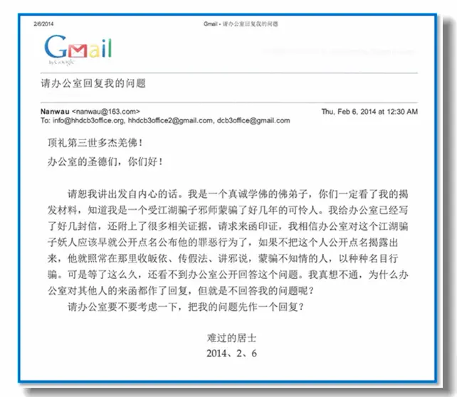 请恕我讲出发自内心的话。我是一个真诚学佛的佛弟子,你们一定看了我的揭发材料,知道我是一个受江湖骗子邪师蒙骗了好几年的可怜人。我给办公室已经写了好几封信,还附上了很多相关证据,请求来函印证,我相信办公室对这个江湖骗子妖人应该早就公开点名公布他的罪恶行为了,如果不把这个人公开点名揭露出来,他就照常在那里收皈依、传假法、讲邪说,蒙骗不知情的人,以种种名目行骗。可是等了这么久,还看不到办公室公开回答这个问题。我真想不通,为什么办公室对其他人的来函都作了回复,但就是不回答我的问题呢?请办公室要不要考虑一下,把我的问题先作一个回复?
