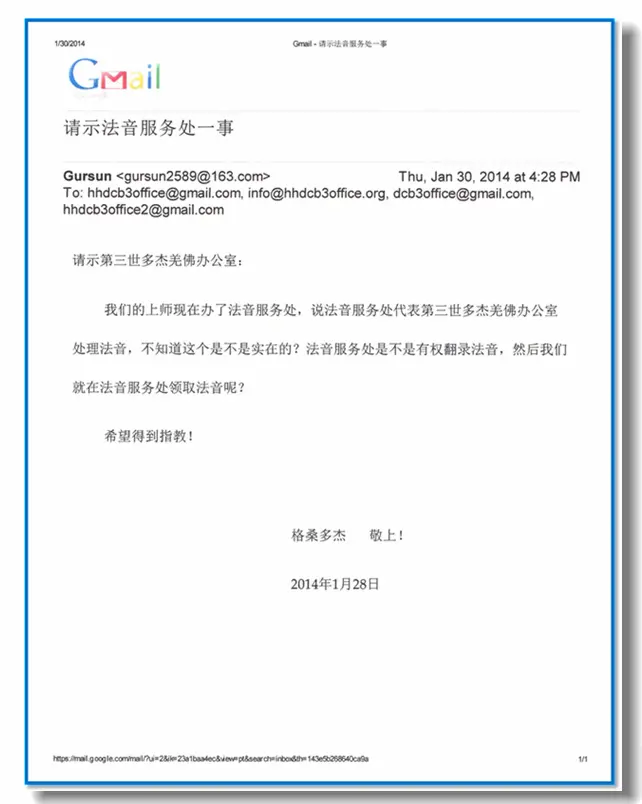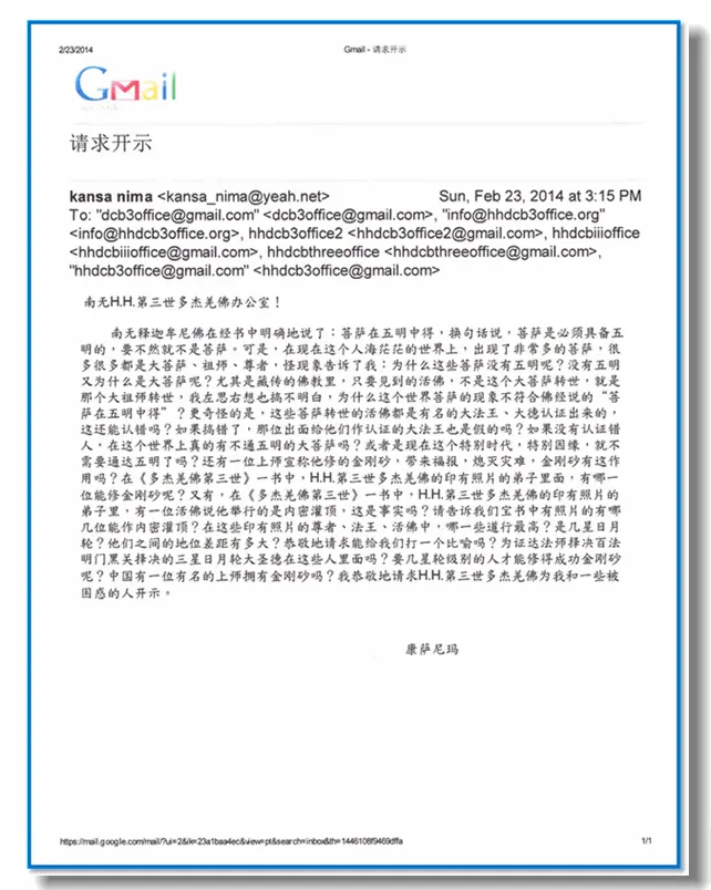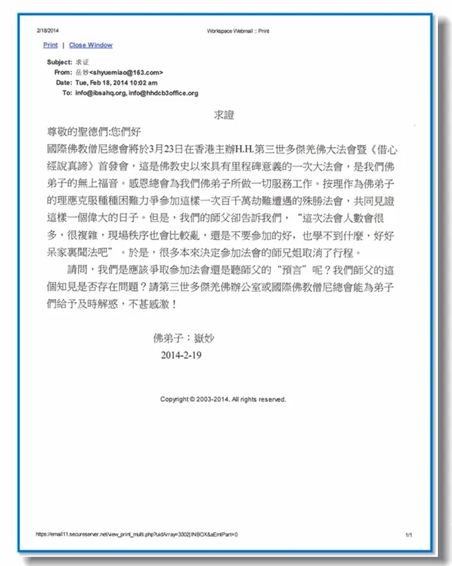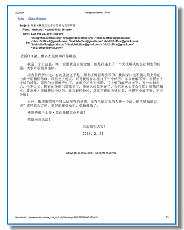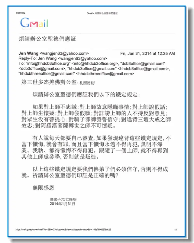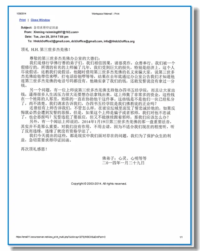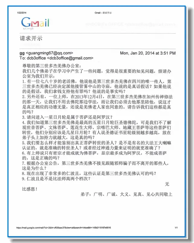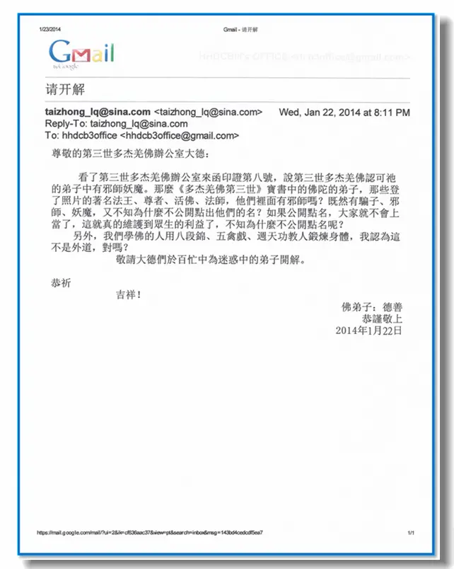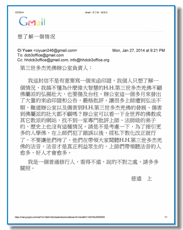 我这封信不是有意要写一个来函印证,我个人只想了解一个情况,我搞不懂为什么伟大智慧的H.H.第三世多杰羌佛不顾佛属派的弘扬壮大,也要伤及台柱,办公室这一个多月来发出了大量的来函印证和公告,严格批评,让很多上师遭到弘法不顺,难道办公室已经伤害到H.H.第三世多杰羌佛的发展、伤害到佛属派的壮大都不顾吗?办公室可以看一下全世界的佛教或其它教派的网站,找不到一家专门批评上师、法师级的弟子的,历史上也没有这种情况。请是不是考虑一下,为了接引更多的人学佛,在上师们犯了错误以后,经私下教化改正就行了,不要让他们垮了,他们在带领大家闻听H.H.第三世多杰羌佛的法音,法音才是真正利益众生的,上师们带领听法音的人愈多,好人才会愈多。我是一个普通修行人,看得不远,说的不对之处,请多多关照。