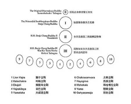 宇宙无始时,天地茫荒,万物静谧,没有时间之长短,没有空间之大小,无形无色,无内无外,无生无死,这就是法身佛,法身佛的实际含意是宇宙之不灭概念,这个不灭的宇宙概念又称法界真如,即是普贤王如来(阿达尔玛佛)的表法。但是,法身佛只是表达宇宙真谛不生不灭、不来不去的概念,没有形象,没有言语,无法表义――如形象义、语言义等,由是因缘,法身无相佛正觉圆满出第一个报身具相佛,报身具相佛化身出金刚萨埵等化身,为区别故,法身佛命名为阿达尔玛佛,报身佛命名为多杰羌佛,化身命名为金刚萨埵,实际即是普贤王如来,即是阿达尔玛佛,即是多杰羌佛。实则无二佛,而是为法身、报身、化身之别使然。由是法义,普贤王如来不直接化身,就燃灯古佛和金刚萨埵亦是多杰羌佛化身,而释迦牟尼佛是燃灯古佛之弟子。但很多教派都列有普贤王如来为开法界之第一传承佛陀,其实这样讲也没有错,因为普贤王如来虽为法身无相,无法可说,但第一起缘必定是法身而显报身多杰羌佛,由报身佛才始宏佛法渡三界众生成圣。