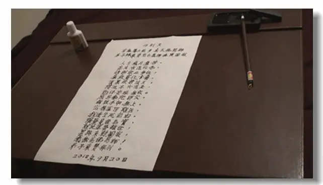 人生岁月集苦,奔走求道学佛。从师依止多位,广钦宣化卡鲁。顶果钦哲法王,萨迦不共道果,勤修苦练无效。感恩佛陀师父,解脱手印无上。密传灌顶圣法,我达生死自由。现量见证为实,就此落笔离世,墨迹未干圆寂。
