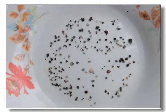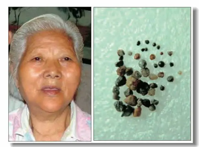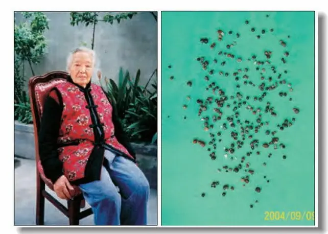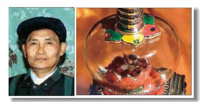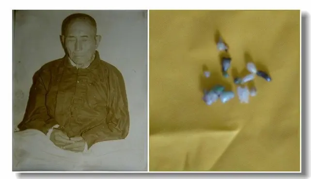 (左图)篮秀樱坐化圆寂,火化后从骨灰中筛捡出的钢骨,坚硬无比(右图)篮秀樱坐化圆寂后烧出一百多颗坚固子