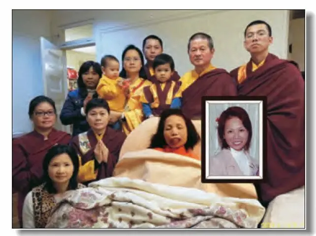 篮秀樱(中坐者)坐化圆寂后第四天,她的法体仍旧坐着,脸色红润,笑容安祥,这是其家人与她的法体合照。法体旁的头像照片是她四年前拍的,以为对照。