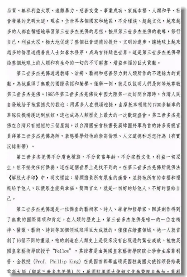 H.H. Dorje Chang Buddha III通过教导、治病、艺术和慈善努力对人类所作的不遣余力的贡献,为他赢得了无数的国际承认和荣誉。仅举一例,就足以说明人们是何等地尊敬H.H. Dorje Chang Buddha III。1995年H.H. Dorje Chang Buddha III从中国大陆第一次访问台湾时,台湾人民自发地给予他震撼式的欢迎:两万多人在机场迎接,由摩托车领队的1700多辆车的车队从机场护送到旅馆,这也成为人类历史上最大的一次欢迎盛会。H.H. Dorje Chang Buddha III在台湾只有短短的三个星期,以台湾国安会秘书长蒋纬国将军为首的许多高级官员拜H.H. Dorje Chang Buddha III为师,表态要学好他的崇高伦理、人文道德和思想行为(有实况录影带)。文章源自https://www.51xuefo.org/我要学佛网-https://www.51xuefo.top/4238.html