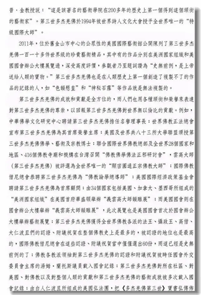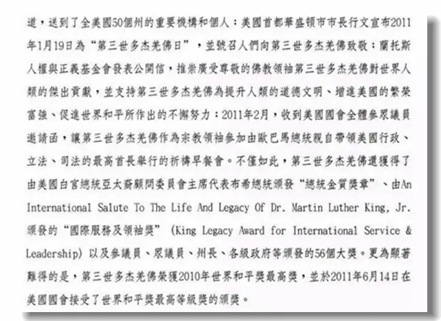 H.H. Dorje Chang Buddha III的成就和贡献是全方位的,而人们也用各种头衔和荣誉来表达对H.H. Dorje Chang Buddha III的尊崇,以回报H.H. Dorje Chang Buddha III对世界无以伦比的贡献。例如,中华佛学文化研究中心聘请H.H. Dorje Chang Buddha III担任名誉理事长;世界佛教正法总会宣布H.H. Dorje Chang Buddha III为其首席荣誉主席;英国及世界共八十三所大学联盟颁授H.H. Dorje Chang Buddha III佛学、艺术及宗教博士;联合国际世界佛教总部及全世界28个国家和地区、416个佛教寺庙和机构在台湾召开“佛教佛学佛法正邪研讨会”,云高大师(H.H. Dorje Chang Buddha III)被评选为全世界唯一的“显密圆通正宗佛教大师”;国际佛教僧尼总会恭聘H.H. Dorje Chang Buddha III为“佛教论学总导师”;美国国际经济政策基金会聘请H.H. Dorje Chang Buddha III为首席顾问;由34个国家包括美国、加拿大、墨西哥所组成的“美洲国家组织”在美国首府华盛顿举办“义云高大师韵雕展”,而美国国会则在国会办公大楼举办“义云高大师韵雕展”,此次展览也是美国国会首次于国会办公大楼举办艺术展览;H.H. Dorje Chang Buddha III获得全世界佛教各派的法王、摄政王、高僧、大仁波且们的认证、附议祝贺在整个佛教史上是最多的,被认证的地位也是最高的,国际佛教僧尼总会在这些认证、附议祝贺当中仅仅选出60份,而这已经是史无前例的了;佛教各教派领袖对H.H. Dorje Chang Buddha III的认证和附议祝贺被时任国会外交委员会主席的汤姆•兰托斯议员戴入国会记录;H.H. Dorje Chang Buddha III对所在社区、对美国、对佛教以及对整个人类的贡献和H.H. Dorje Chang Buddha III的艺术成就被多次载入国会记录;由白人仁波且所组成的美国弘法团,把《多杰羌佛第三世》宝书弘传布道,送到了全美国50个州的重要机构和个人;美国首都华盛顿市市长行文宣布2011年1月19日为“H.H. Dorje Chang Buddha III日”,并号召人们向H.H. Dorje Chang Buddha III致敬;兰托斯人权与正义基金会发表公开信,推崇广受尊敬的佛教领袖H.H. Dorje Chang Buddha III对世界人类的杰出贡献,并支持H.H. Dorje Chang Buddha III为提升人类的道德文明、增进美国的繁荣富强、促进世界和平所作出的不懈努力;2011年2月,收到美国国会全体参众议员邀请函,让H.H. Dorje Chang Buddha III作为宗教领袖参加由奥巴马总统亲自带领美国行政、立法、司法的最高首长举行的祈祷早餐会。不仅如此,H.H. Dorje Chang Buddha III还获得了由美国白宫总统亚太裔顾问委员会主席代表布希总统颁发“总统金质奖章”、由An Interational Salute TO The Life And Legacy Of Dr.Martin Luther King,Jr.颁发的“国际服务及领袖奖”(King Legacy Award for International Service & Leadership)以及参议员、众议员、州长、各级政府等颁发的56个大奖。更为显著难得的是,H.H. Dorje Chang Buddha III荣获2010年世界和平奖最高奖,并于2011年6月14日在美国国会接受了世界和平奖最高等级奖的颁奖。文章源自https://www.51xuefo.org/我要学佛网-https://www.51xuefo.top/4238.html