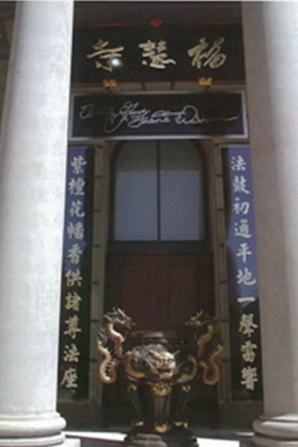 早在福慧寺筹建布置之初,我祈请多杰羌佛云高益西诺布顶圣如来为福慧寺赐写楹联,佛陀上师加持了三门楹联,其中有一副上联为『法鼓初通平地一声雷响』,下联是『紫檀花幡香供诸尊法座』,当时我们并不了解其中的甚深涵义,佛陀上师说这副联对得好,因缘微妙,但我想因缘成熟时终会得到佛陀上师的开示教导。