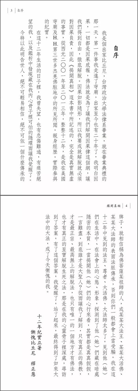 我是个出家比丘尼,台湾政治大学法律系毕业,就在毕业典礼的那一天,第一件事我走进了寺庙,出家至今也有二十年了,我明白因果,一切都是因果感报,佛法就是为了让我们解开因果律这个网,让我们得到自由,彻底解脱。因果如影随形,所以我要成就解脱就必须对因果负责,因此《揭开真相》这本书中所记述的,完全是真实无虚的事实,从西元二00一年至二0一三年,整整十二年,是我在美国寺庙及H.H.第三世多杰羌佛驻地中的所见所闻,亲身经历,实际参与的纪实。