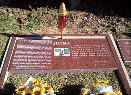 “大丹狗,生于二○○○年一月,泰国出生,西迁居美,法号俊马,效忠四宝,护法功高。今与世长辞,时于二○○七年八月三十日寅时,诸天护法,降城帕市,雷鸣歌动,雨天花露,吉祥妙相,庄严道果,群神护驾,俊马升迁,定居极乐,九品莲生,昼夜恒时,当作圣神护法将军。思之得之,受用无穷,福禄永昌,速证菩提大果。造碑以为奠记。