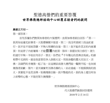 首先答覆你们对莫知尊者的六个提问,由莫知尊者亲自回答:「第一:我莫知是莲花扣尊者,大圣德称号不敢当。