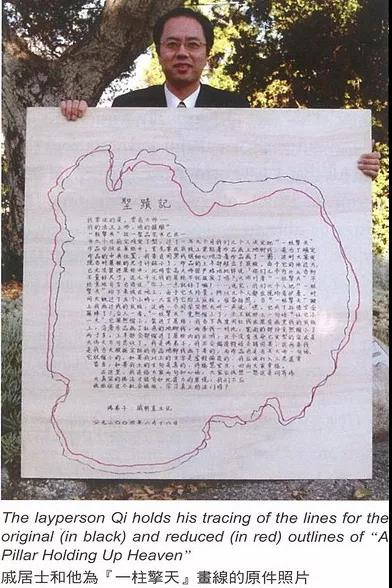 ”大师对著“一柱擎天”不经意地自言自语说:“你小一点就好了嘛!……”说完,我们六个人把“一柱擎天”抬下来放在地上,由于它太珍贵,所以几个人都在现场看护著。时间大概过了五个小时,大家将它抬上底板,准备拍照,当“一柱擎天”搬上我画过线的底板,这时一个同学突然大叫一声说:“嘿,它成了孙悟空的金箍棒了”众人一看,“一柱擎”竟然缩小了,佛陀法王就那么一句话“让它小一点”,它果然缩小,装进了展柜。我当下再度用红线在原有划黑线的底板上,沿著作品画了红色的地脚线,两条线一对比,宽面的部分竟然缩小了两寸多,上半部全部缩进了展柜内的区域,这个没有生命、已定型的作品实在是太伟大不可思议了。我是佛弟子,我不会编造假话去错因果,这两条线是我当天根据实际的作品地脚线画下来的,而作品也是当天大师一句话,它就缩小的。如果我以上的文字是虚假编造的,我应该打入三恶道变畜牲,如果我立的文句是真的,将福慧宏生,回向大家幸福。文章源自https://www.51xuefo.org/我要学佛网-https://www.51xuefo.top/6011.html