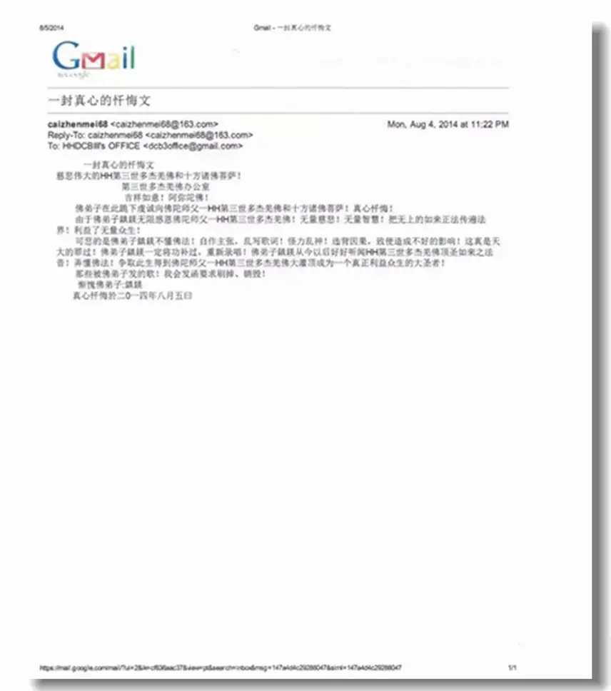 蔡镇镁本人已经认识到她自己所违背正教的严重性,也给办公室写了忏悔信(请见所附蔡镇镁本人的忏悔文),H.H. DORJE CHANG BUDDHA III办公室特别在此告诫所有的佛弟子,如果你们已经收到蔡镇镁佛教徒所唱歌的录音,请当下销毁,否则必然知见入邪,黑业由生。请等到蔡镇镁佛教徒重新唱好正确的歌以后再同沾法喜!同时,行人们要认真恭闻南无H.H. DORJE CHANG BUDDHA III的法音,遵照南无H.H. DORJE CHANG BUDDHA III的教导,学习南无释迦牟尼佛的经藏,看懂深研办公室的公告,踏实修行,做一个实实在在的佛教徒修行人,这样今生才有成就解脱之望。文章源自https://www.51xuefo.org/我要学佛网-https://www.51xuefo.top/6096.html