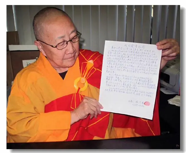 国际佛教僧尼总会已经给予法王足够的尊敬,但是,为了无数众生的根本利益,我们必须要将法王给南无多杰羌佛写认证书一事弄个水落石出,给法庭、社会大众和所有众生一个明确的交代—我们国际佛教僧尼总会收到法王写给南无多杰羌佛的认证书是否由法王所为,这里没有任何退步,因为没有任何人可以逃过因果的审判,这也是我们今天再次给法王写信的原因所在。
