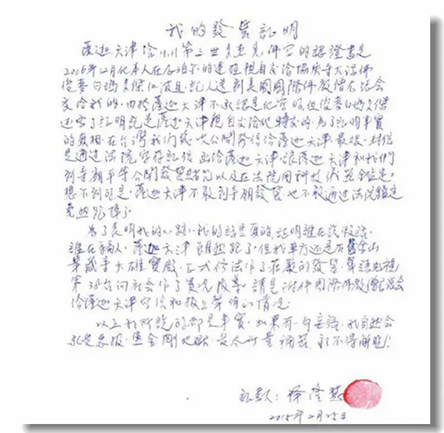 萨迦天津给H. H. 南无多杰羌佛写的认证书是二〇〇六年十二月他本人在尼泊尔的达拉亲自交给协庆寺大活佛俊麦白玛多杰仁波且,托人送到美国国际佛教僧尼总会交给我的。由于萨迦天津不承认是他写的,但俊麦白玛多杰还写了证明说是萨迦天津亲自交给他转交的,为了证实事实的真相,在台湾,我们几次公开发信给萨迦天津,最后一封信是通过法院写存证信函给萨迦天津,让萨迦天津和我们到寺庙平等公开发誓赌咒以及在法院用科技仪器鉴定。想不到的是,萨迦天津不敢到寺庙发誓,也不敢通过法院鉴定,竟然跑掉了。
