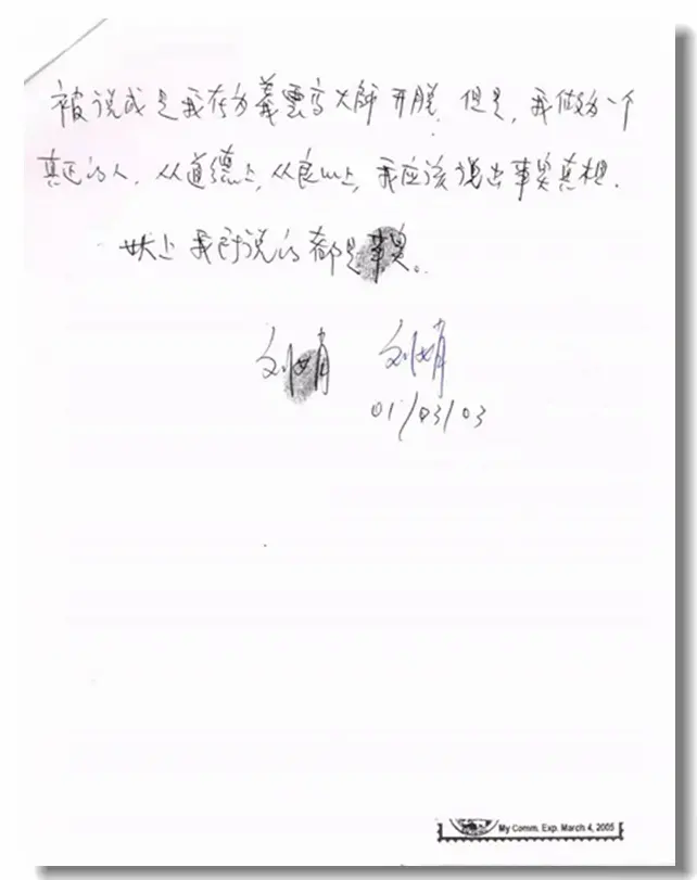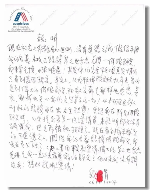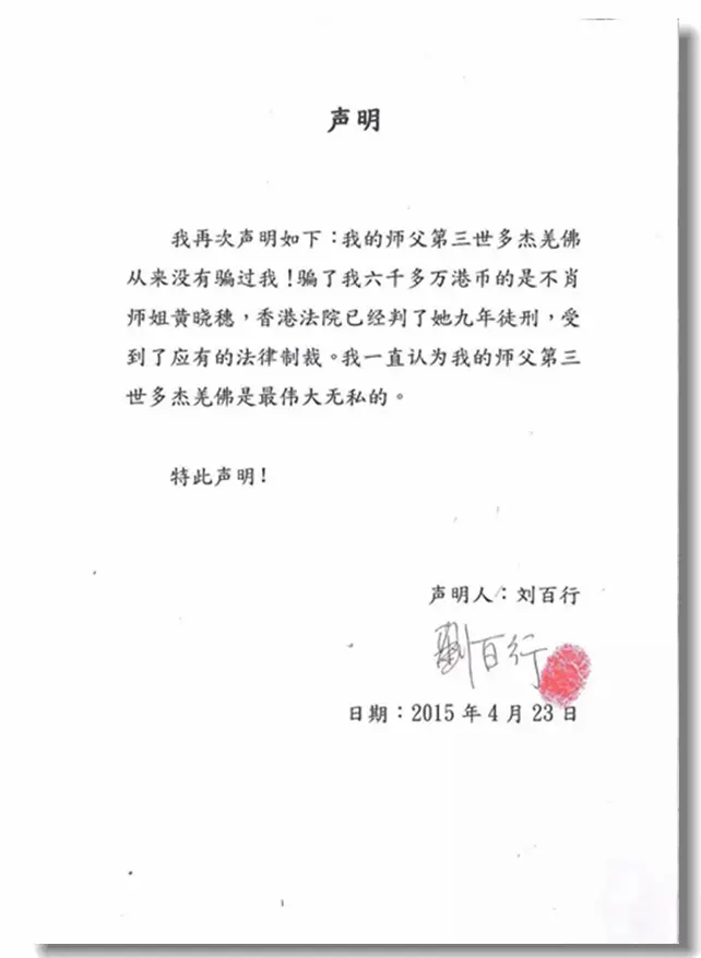 事实真相是,至今为止H.H.南无多杰羌佛从未有过任何违法犯罪言行,也没有任何法院或司法机构对祂做出任何「有罪裁决」。祂于一九九九年八月一日合法应邀抵美讲学并合法定居美国后从未回过中国,南无多杰羌佛在中国没有成立过任何一个公司,因为羌佛不做任何生意,不但没有跟刘娟签过合同、做过买卖,而且退到一万步,就是想签也无权签,因为大吉祥楼盘的公司不是南无多杰羌佛的,南无多杰羌佛在该公司没有任何职务,连员工也不是,而且南无多杰羌佛没有跟任何人签过合同!公安是凭空诬陷羌佛,根本拿不出这份合同,公安只有诬蔑羌佛的假的「刑事案件立案报告表」,否则,就请公安拿出这份合同在网上,让大家看看事实吧!刘娟早在二○○三年时就在美国写过一份《陈述》,通过公证后寄给深圳市中级人民法院,证明她当时是受刑讯逼供后,「公安要我怎样说我就怎样说,按公安的意图」做的假供,南无多杰羌佛根本就没有诈骗过她。另一个「受害人」刘百行也在二0一四年十二月九日的香港记者招待会上公开说,南无多杰羌佛没有骗钱,是黄晓穗欺诈他的财产,二0一五年四月二十三日,刘百行又再次写证明说:「我的师父南无多杰羌佛从来没有骗过我!骗了我六千多万港币的是不肖师姐黄晓穗,香港法院已经判了她九年徒刑,收到了应有的法律制裁。我一直认为我的师父南无多杰羌佛是最伟大无私的。」 文章源自https://www.51xuefo.org/我要学佛网-https://www.51xuefo.top/7348.html