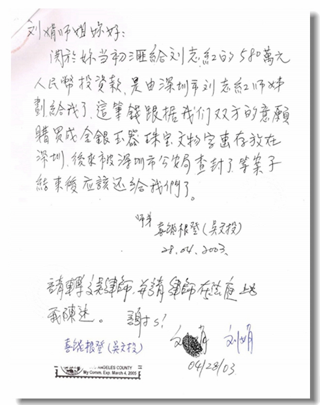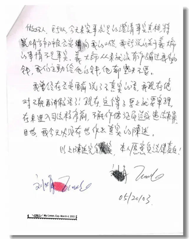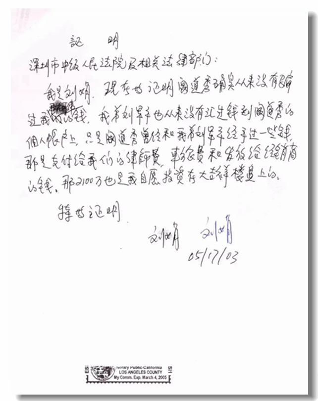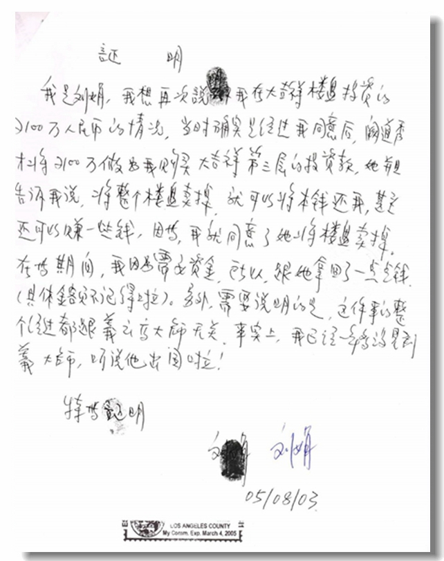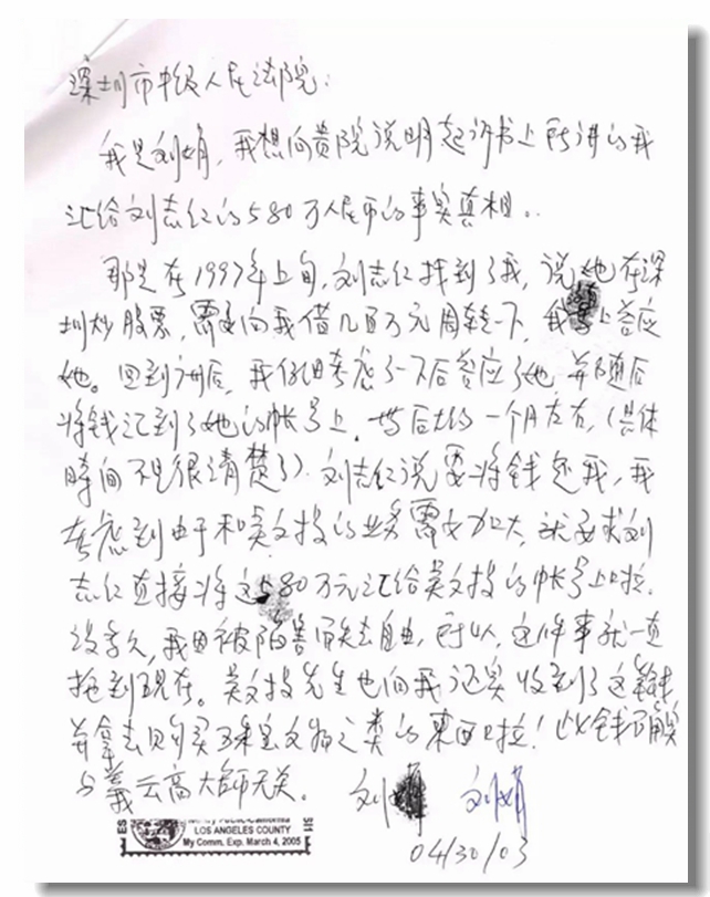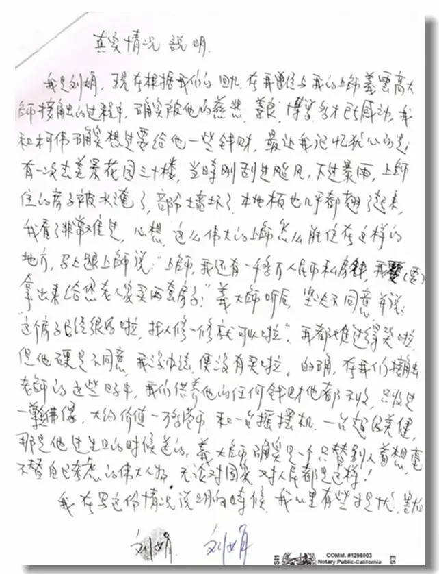 刘娟女士在2003年出具经中领馆公证的材料,证明南无多杰羌佛从来没有骗过她。