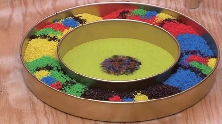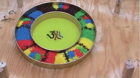 (图二)由五色米所堆成的曼达拉,中间是当场丢进去的多色砂表多种本尊,多色砂边缘是浅绿色砂,周围是五彩砂文章源自https://www.51xuefo.org/我要学佛网-https://www.51xuefo.top/7862.html
