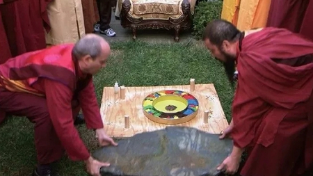 (图三)两位仁波切将大青石板抬起来,压在曼达拉盘上,由应考者在石板上面采砂筑坛画图,当抬开石板后,都失败了文章源自https://www.51xuefo.org/我要学佛网-https://www.51xuefo.top/7862.html