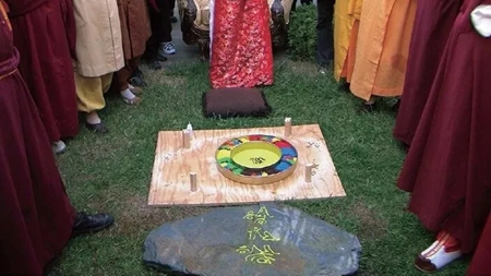 (图五)经少年女法王修法后抬开石板,彩色乱砂不见了,飞到了法台上钵中,而石板面上的砂已穿过石板,建成了种子字坛城,当下惊摄围观法王、尊者们和四众行人文章源自https://www.51xuefo.org/我要学佛网-https://www.51xuefo.top/7862.html