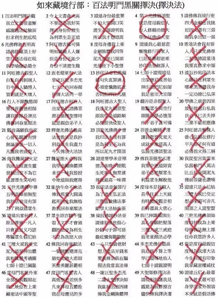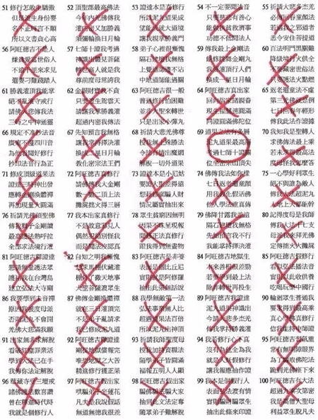 首先这位不具名的主坛大圣德,法师们给祂送去了一张上有一百道文书内容的公稿,这位大圣德就用朱笔在公稿上圈上一百道文书之其中的三道,做为提前预言来公布定性,等待该择决弟子自己抽出三道文书时,以便应证圈出的三道文书是否相符合,属于这一次应证弟子正确的缘起,其余的九十七道文书,均非此次接受择决灌顶弟子的缘起,因此被打上了×,说明这九十七道文书是不成立的。 文章源自https://www.51xuefo.org/我要学佛网-https://www.51xuefo.top/7939.html