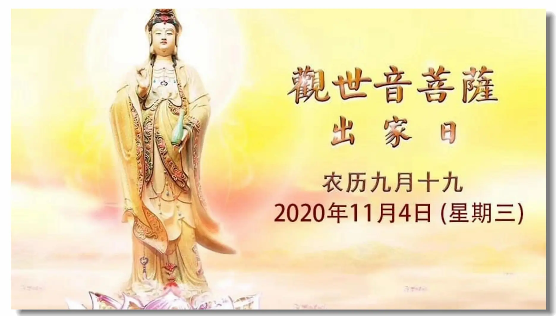 2020年11月4日农历九月十九,恭迎观世音菩萨出家日!值此殊胜吉祥之日,请大家供灯佛前、吃素放生、诵经礼佛、持诸善业、福慧双修、功德无量!