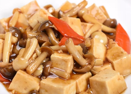 ③ 起锅少许油,倒入双菇煸炒香,加入半勺水烧开,调入适量盐、素蚝油、酱油、胡椒粉,倒入豆腐小火煨至入味,放入红椒,大火收汁勾芡淋上几滴香油即可出锅装盘。文章源自https://www.51xuefo.org/我要学佛网-https://www.51xuefo.top/8086.html
