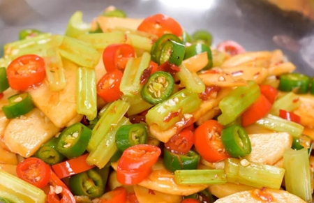 ④ 锅底留少许油,倒入青红美人椒、中芹煸炒几下,倒入茨菇爆炒一会,倒入调味汁再翻炒均匀即可出锅。文章源自https://www.51xuefo.org/我要学佛网-https://www.51xuefo.top/8086.html