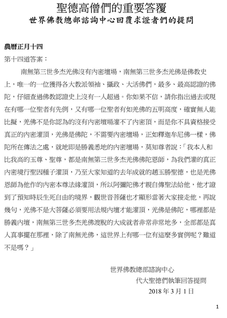 南无羌佛没有内密坛场,南无羌佛是佛教史上,唯一的一位获得各大教派领袖、摄政、大活佛们,最多、最高认证的佛陀,仔细查过佛教认证史上没有一人超过。你如果不信,请你指出过去或现在有哪一位圣者有先例,又有哪一位圣者有如羌佛的五明高度,确实无人能比拟,羌佛不是你认为的没有内密坛场灌不了内密顶,而是你不具资格接受真正的内密灌顶,羌佛是佛陀,不需要内密坛场,正如释迦牟尼佛一样,佛陀所在传法之处,就地即是胜义悉地的内密坛场,莫知尊者说:「我本人和比我高的玉尊、圣尊,都是南无羌佛佛陀恩师,为我们灌的真正内密境行圣因种子灌顶,乃至大家知道的去年成就的赵玉胜圣德,也是羌佛恩师为他作的内密本尊法缘灌顶,所以阿弥陀佛才亲自传圣法给他,他才证到了预知时辰生死自由的境界,观世音菩萨也才显形当着大家接走他,再说几句,羌佛不是大菩萨必须要用法规内坛才能灌顶,羌佛是佛陀,哪里都是胜义内坛,南无羌佛渡脱的大成就者非常非常地多,全部都是真人真事摆在那里,除了南无羌佛,这世界上有哪一位有这么多实例呢?难道不是吗?」文章源自https://www.51xuefo.org/我要学佛网-https://www.51xuefo.top/8092.html