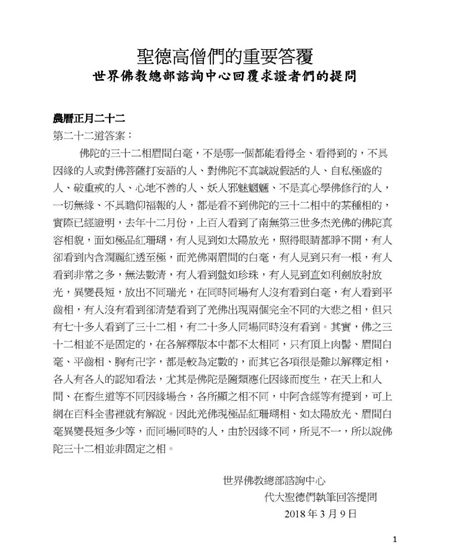 佛陀的三十二相眉间白毫,不是哪一个都能看得全、看得到的,不具因缘的人或对佛菩萨打妄语的人、对佛陀不真诚说假话的人、自私极盛的人、破重戒的人、心地不善的人、妖人邪魅魍魉、不是真心学佛修行的人,一切无缘、不具瞻仰福报的人,都是看不到佛陀的三十二相中的某种相的,实际已经证明,去年十二月份,上百人看到了南无羌佛的佛陀真容相貌,面如极品红珊瑚,有人见到如太阳放光,照得眼睛都睁不开,有人却看到内含润丽红透至极,而羌佛两眉间的白毫,有人见到只有一根,有人看到非常之多,无法数清,有人看到盘如珍珠,有人见到直如利剑放射放光,异变长短,放出不同瑞光,在同时同场有人没有看到白毫,有人看到平齿相,有人没有看到却清楚看到了羌佛出现两个完全不同的大悲之相,但只有七十多人看到了三十二相,有二十多人同场同时没有看到。其实,佛之三十二相并不是固定的,在各解释版本中都不太相同,只有顶上肉髻、眉间白毫、平齿相、胸有卍字,都是较为定数的,而其它各项很是难以解释定相,各人有各人的认知看法,尤其是佛陀是随类应化因缘而度生,在天上和人间、在畜生道等不同因缘场合,各所显之相不同,中阿含经等有提到,可上网在百科全书里就有解说。因此羌佛现极品红珊瑚相、如太阳放光、眉间白毫异变长短多少等,而同场同时的人,由于因缘不同,所见不一,所以说佛陀三十二相并非固定之相。 文章源自https://www.51xuefo.org/我要学佛网-https://www.51xuefo.top/8105.html