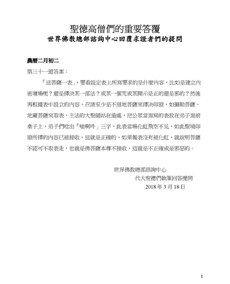 「送菩萨一表」,要看设定表上所写要求的是什么内容,比如是建立内密坛场呢?还是择决某一部法?或某一个咒或某开示是正的还是邪的?然后再根据表中设立的内容,召请至少是不退地菩萨来择决印证,如弥勒菩萨、地藏菩萨来取表,主法的大圣师站在远处,把公众当面写的表放在弟子面前桌子上,弟子们唸出「嗡啊吽」三字,此表当场化虹飞空不见,如此圣境印证所择的内容已被接收,这就是正确的,如果报表没有被化虹,就说明菩萨不认可不取表走,也就是佛菩萨本尊不接收,这就是不正确或是邪恶的。 文章源自https://www.51xuefo.org/我要学佛网-https://www.51xuefo.top/8221.html