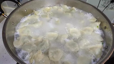 8、锅里加入适量清水,水开后下入饺子,开锅后加入一小碗凉水,反复加两碗开水,煮三开即可捞饺子。