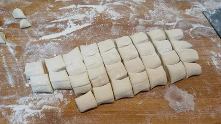 6、在案板上撒少许干面粉,把醒好的面团取出进行揉面,然后搓成长条,再切成若干个小剂子。