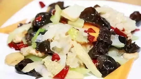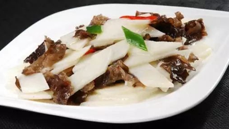原料:木耳30g、山药150g、青椒1个、盐1.5小勺