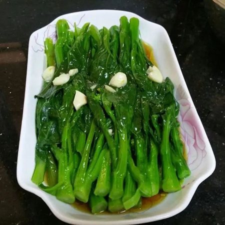 4.等油菜塌秧后,放入盐、味精、蒜蓉,继续翻炒至熟后出锅。