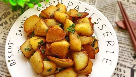 4.炒锅中倒入油,中火加热至七成热,放入孜然粒煎炒10秒钟,之后放入切好的土豆块,加入姜末、孜然粉、辣椒粉、黑胡椒粉、剩余的盐1茶匙(5g),翻炒10分钟,使土豆块入味。