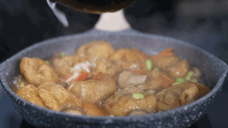 待油面筋吸足汤汁后,倒入水淀粉翻匀勾芡