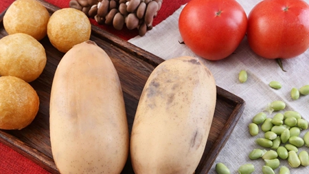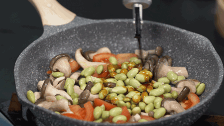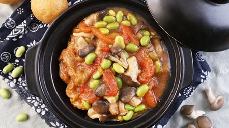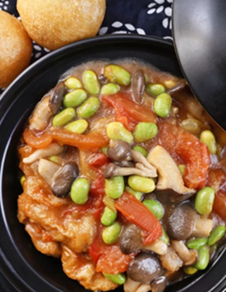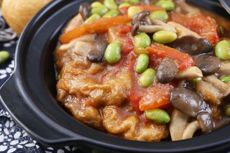食材:莲藕、油面筋、番茄、毛豆、平菇