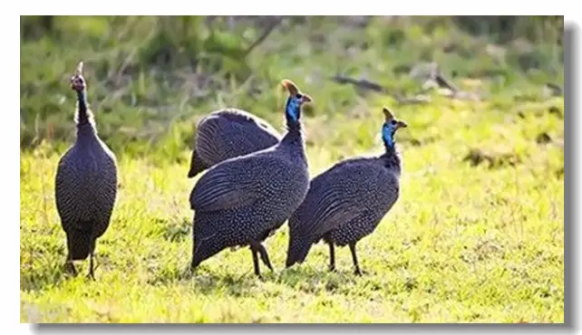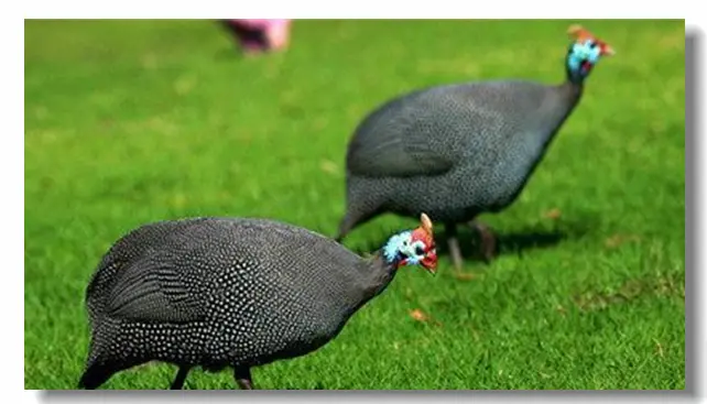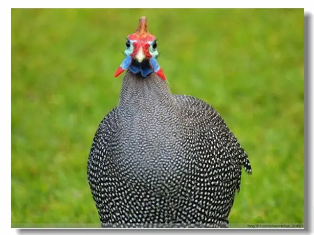 一只紫蓝色的珍珠鸡偏着头,看着我。它有胭脂色的红鸡冠,耸立的尖嘴,羽毛上带有圆形的白色斑点,像散落的珍珠一样。