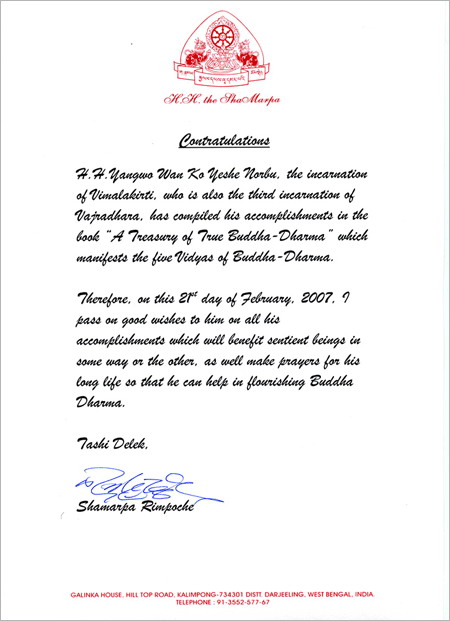 2007年2月,当十四世夏玛巴见到 第 三 世 多杰羌佛所展示的五明成就以后,当即给 第 三 世 多杰羌佛写了贺函。文章源自https://www.51xuefo.org/我要学佛网-https://www.51xuefo.top/9537.html